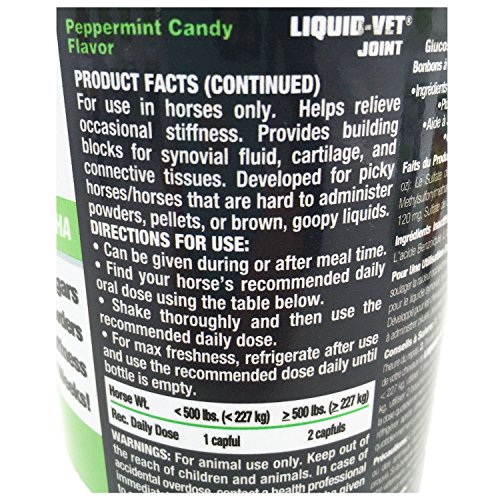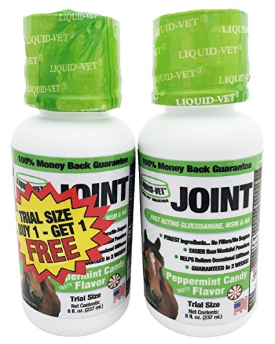 Liquid-Vet Joint Support features all-natural glucosamine sulfate plus 3 other leading joint care ingredients, which forms an effective supplement for relieving pain in joints and prevent joint-related issues from worsening. It also helps relieve occasional stiffness. It provides building blocks for synovial fluids, cartilage and connective tissues. Developed for horses that are hard to administer pills, powders or chews, simply pour over your horses' food once per day.Feature