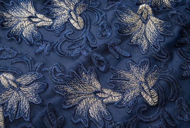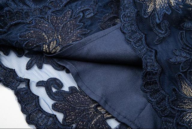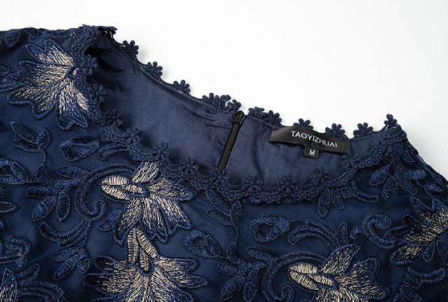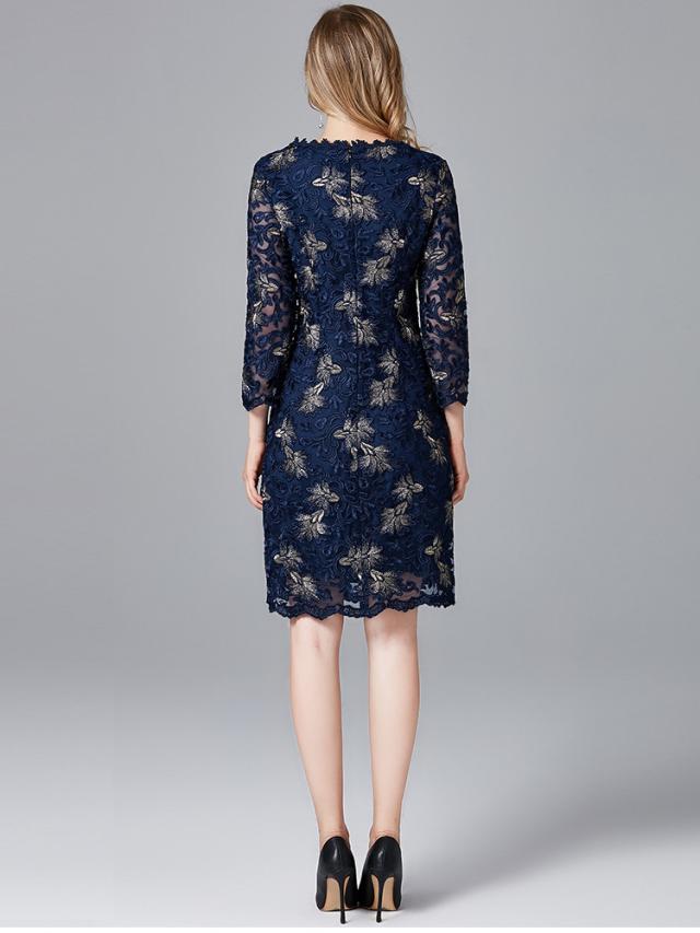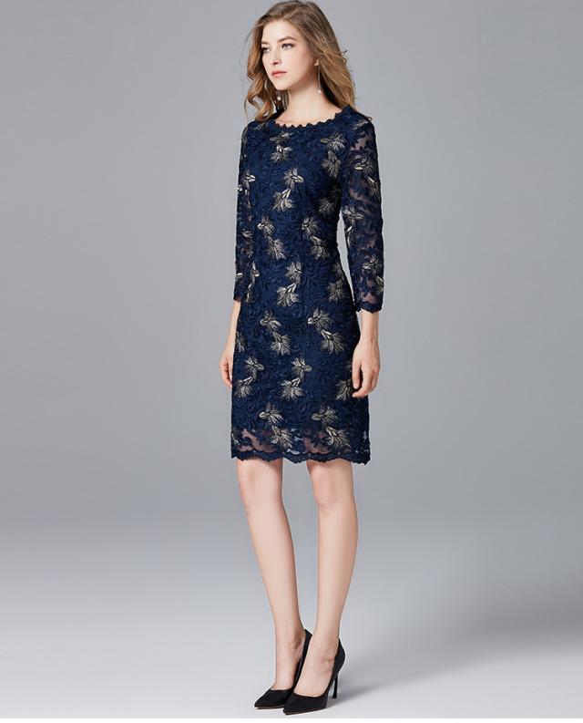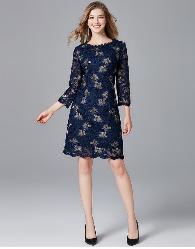 レース 刺繍 七分袖 長袖 ワンピース パーティードレス 結婚式 二次会 披露宴 パーティー デート 女子会 食事会 卒業式 謝恩会 親族 お呼ばれ フォーマル 演奏会 コンサート 発表会 膝下 大きいサイズ L 2L 3L 4L 5L ネイビー フレア 30代 40代 50代