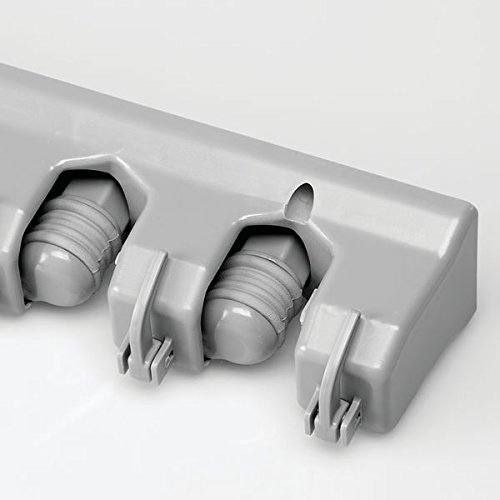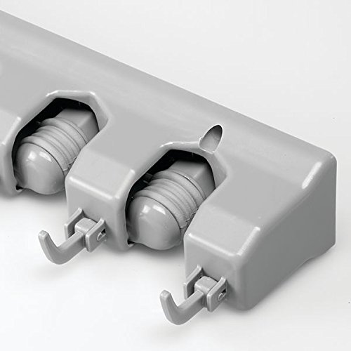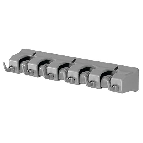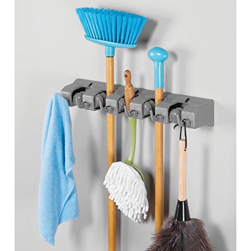 Holder has five slots with rubber grips that lock mops and brooms into place; Six retractable hooks provide extra storage and fold upward when not in use