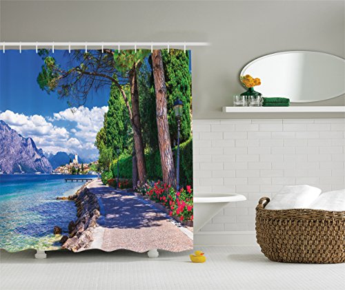 Ambesonne Cottage Decor Collection, Scenic of Lago di Garda Malcesine Italy from Stone Bicycle Road with Flowers Trees Lake Picture, Polyester Fabric Bathroom Shower Curtain, Crimson Green Blue Ivory
