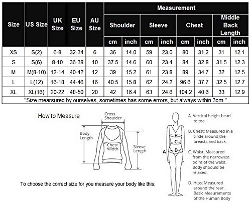 M=== US(8-10)Shoulder:15.2 inch---Sleeve:23.8 inch---Chest:34.7 inch---Middle Back Length:12.5 inch