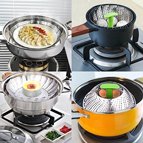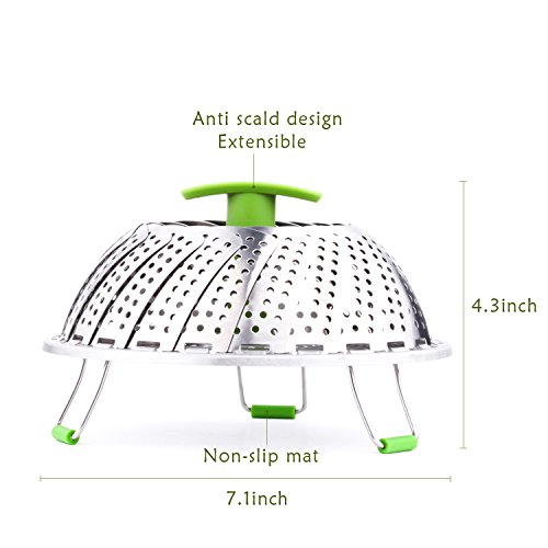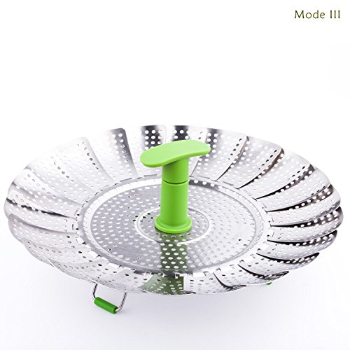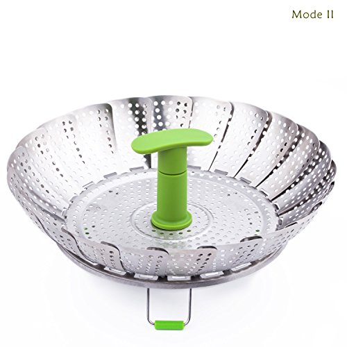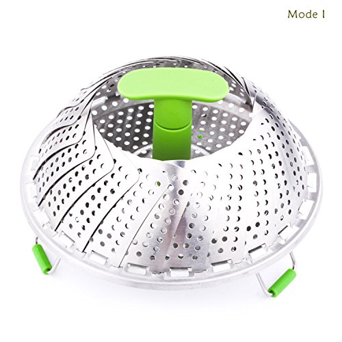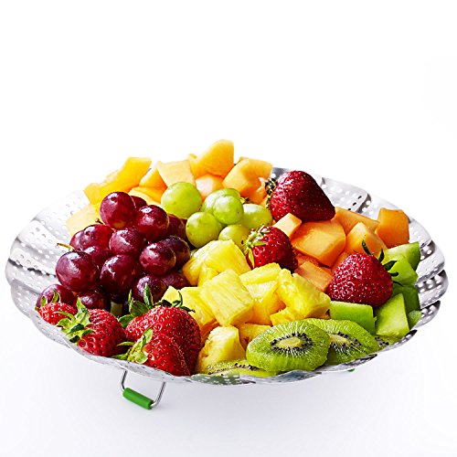 PEMOTech's stainless steel steamer works well for steamed fresh vegetables, various fruits, and other steamed food. Made of premium stainless steel, non-toxic, durable, diswasher safe, FDA and LFGB approved. The telescoping handle allows for safe and easy insertion and removal from even the deepest pots, and save space for storage. The feet on the steamer is foldable for storage, open up smoothly and stand steadily while