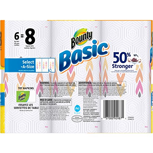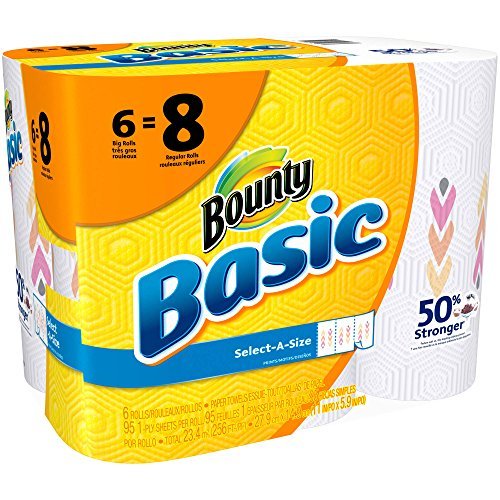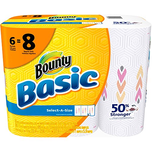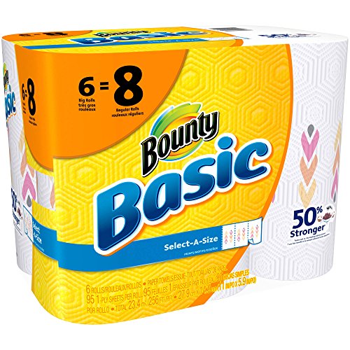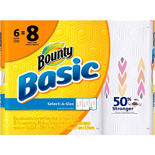 Studio : Bounty Publisher : Bounty Binding : Kitchen Product Description These Bounty Basic Big Roll Select-a-Size Print Paper Towels are a smart choice for people who like to be prepared. With them, you can be ready to clean your next mess or spill without hassle. These white paper towels, 95 sheets, 6 rolls feature nontraditional perforation marks so when you go to rip one off, you can decide if you want it to be smaller or larger. These towels are two times more absorbent, which allows you to use less of them. Their unique Trap Lock Technology quickly absorbs messes so you can clean up and move on without wasting time or towels. Conveniently, these Bounty paper towels are available in a wide variety of sizes and prints. This package includes six rolls, each of which has 95 sheets. By buying in bulk, you can save yourself multiple trips to the store. Keep the extra rolls in your kitchen, garage or wherever is convenient. 0