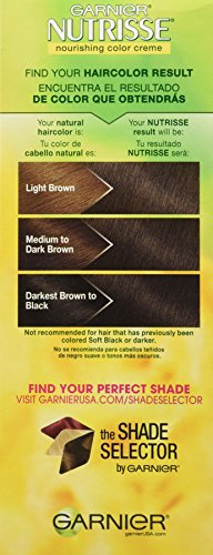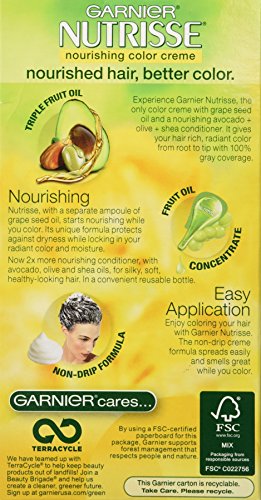 Experience Garnier Nutrisse, the nourishing color treatment that gives you rich, healthy-looking color. This exclusive color treatment, enriched with conditioners and fruit oil concentrate, penetrates deeps into hair fibers to deliver rich, long-lasting color that covers gray completely. Enjoy the unique avocado enriched conditioner that harnesses the restorative properties of avocado oil with Vitamin E. It protects against dryness while locking in color and moisture to keep your color radiant and your hair silky soft. With an easy application, you'll love coloring your hair with a nourishing creme formula enhanced with fragrant grape seed oil you only get from Garnier Nutrisse. The non-drip formula spreads easily and smells great when you color.Feature