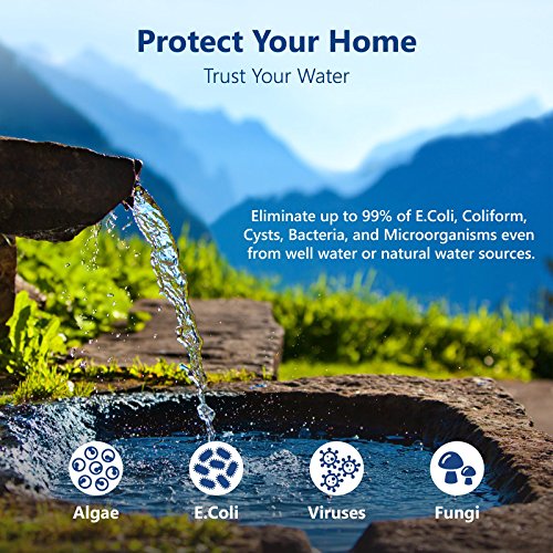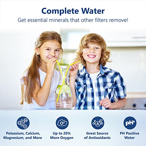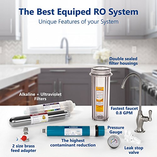 Included Components:Ultraviolet Sterilizer ◼ UV Bulb ◼ 4 gallon Water Storage Tank ◼ Tank Valve ◼ Deluxe Chrome RO Faucet ◼ Pressure Gauge ◼ All filters needed for setup (Sediment, Carbon Block, GAC, RO Membrane, Post Carbon, Alkaline) ◼ Filter Housings ◼ Leak Stop Valve ◼ Filter Housing Wrench ◼ Brass Feed Adapter Valve ◼ Quick Connect Faucet Adapter ◼ 22 feet of 1/4" color poly tubing ◼ Drain Saddle ◼ Teflon Tape ◼ Flow Restrictor ◼ Automatic Shut-Off Valve
