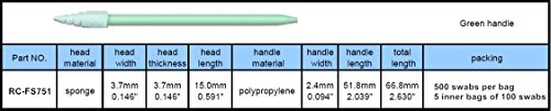 -. Feature : Open cell, foam pointed swab designed for removal of contamination from surfaces in critical environments. / Packaged: 500swabs/bag(5 inner bags of 100 swabs). / Laundered and packed under an Class 100 Cleanroom, The foam exhibits low particles and ion content. / It has excellent compatibility with most solvents including acetone as well as excellent absorbency and solvent-holding capacity . / Tip Size:15mm (0.591in.) L x 3.7mm (0.146in.) D. Overall Length: 66m(2.63in.), polypropylene shaft.
