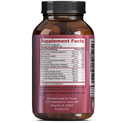 -. Binding : Health and Beauty -. Brand : Tevare -. EAN : 0806810457948 -. Feature : Thyroid support complex to boost thyroid function - pure and natural weight control and metabolism boost capsules - can also help with anti aging + detox the liver / Kelp is a natural source of vitamins including calcium - combines with Tyrosine to create thyroid hormones that regulate metabolism - this can lead to weight loss / Bladderwrack is part of this Thyroid support supplement and is used to help an over-sized thyroid + underactive Thyroid - can also help achieve weight control / Schizandra is a plant and can be used to increase resistance to stress - this can also help to enhance energy as well as the immune system - can also help detox the liver / Ashwagandha is another substance that can be used to enhance cerebral clarity - also effective for decreasing swelling and pain - can also lower blood pressure -. IsAdultProduct : 0 -. Label : Tevare -. Manufacturer : Tevare -. MPN : LE -. PackageQuantity : 1 -. PartNumber : LE -. ProductGroup : Health and Beauty -. ProductTypeName : HEALTH_PERSONAL_CARE -. Publisher : Tevare -. Studio : Tevare -. Title : Thyroid Support Supplement - Pure And Potent Weight Control And Weight Loss Pills - With Kelp + Bladderwrack + Schizandra + Ashwagandha - Boost Immune System - Best Thyroid Support By Tevare -. UPC : 806810457948