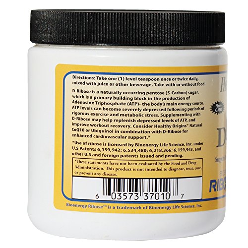 -. Binding : Health and Beauty -. Brand : Healthy Origins -. Department : Health and Beauty>Health and Wellness -. EAN : 0603573370107 -. Feature : May help replenish depressed levels of ATP and improve workout recovery / Supports muscle recovery and cardiovascular health / 100% Natural -. IsAdultProduct : 0 -. IsAutographed : 0 -. IsMemorabilia : 0 -. Label : Healthy Orgins -. LegalDisclaimer : * These statements have not been evaluated by the Food and Drug Administration. This product is not intended to diagnose, treat, cure or prevent any disease. ** Always refer to the manufacturer's label on the product for description, recommended dose and precautions. -. Manufacturer : Healthy Orgins -. Model : 37010 -. MPN : 37010 -. NumberOfItems : 1 -. PackageQuantity : 1 -. PartNumber : 37010 -. ProductGroup : Health and Beauty -. ProductTypeName : HEALTH_PERSONAL_CARE -. PublicationDate : 2013-01-23 -. Publisher : Healthy Orgins -. ReleaseDate : 2013-02-02 -. Size : 10.6 fluid_ounces -. Studio : Healthy Orgins -. Title : Healthy Origins D-Ribose Powder Bioenergy, 10.6 Ounce -. UPC : 884971596188