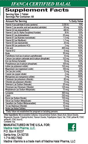 -. Binding : Health and Beauty -. Brand : Madina Vitamins -. EAN : 0091037730039 -. Feature : Contributes To Healthy Immune Function / Contributes to Healthy Bone Health / Assist In Females General Health / Good for Heart Health / 2 Months Supply -. Label : Madina Vitamins -. Manufacturer : Madina Vitamins -. PackageQuantity : 1 -. ProductGroup : Health and Beauty -. ProductTypeName : HEALTH_PERSONAL_CARE -. Publisher : Madina Vitamins -. Studio : Madina Vitamins -. Title : Madina Vitamins - Halal Multivitamins for Women & Minerals (60 Tablets - Daily Supplements) -. UPC : 091037730039