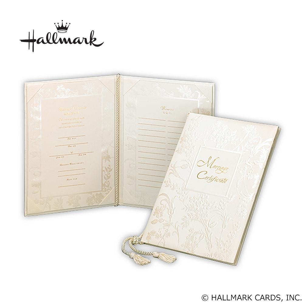 | 米国において100年の歴史を誇るグリーティングカードの老舗、ホールマークがお届けするウエディングコレクション。エンボス、パール箔、金箔など、豪華な加工をあしらったデザインが特徴的な結婚証明書です。また、立会人シートには最大26名まで記入可能です。 |