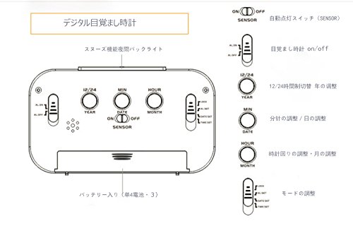 -. Feature : 1.【多機能目覚まし時計】:時間・アラーム・気温・日付を同時に表示、機能豊富な置き時計です。手のひらサイズに欲しい機能がギュッと充実! / 2.【見やすい表示】:10.5x4.7cmの大画面LCDスクリーンで時間/アラーム/温度/曜日などの情報を分かりやすく表示します。必要な情報がすぐに分かるので視認性に優れています。文字が大きく見やすいので老眼の肩や視力の低い方でも安心! / 3.【バックライトとタッチパネル機能】:目覚まし時計はタッチパネルとバックライト機能がありますので、薄暗い所でも設定と読むのは便利になります。 / 4.【コンパクト】:設置場所を選ばないコンパクトなデザインですのでお部屋のどこにでも設置することができます。リビングや勉強机の上、ベッドサイドに設置するのもオススメです。また、携行性も良いので旅行や出張のお供にもお使いいただけます。 / 5.【安心の保証】本時計は6ケ月のメーカー保証が付いており、初期不良・使用中の故障等は交換対応をさせていただきますので、安心してお試しください。ご注意:電波時計ではないので、手動で時計合わせをします。)