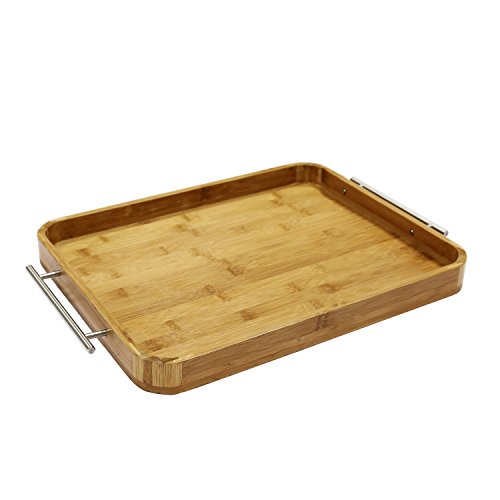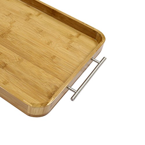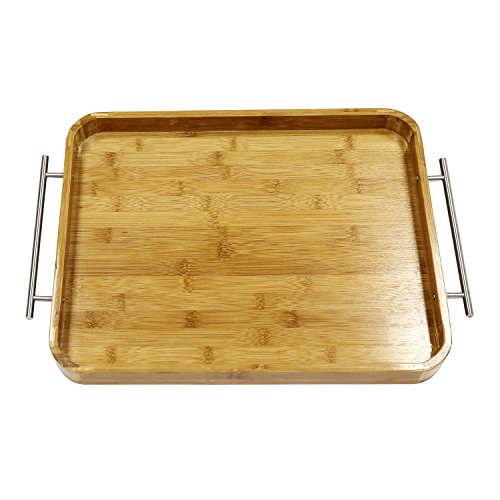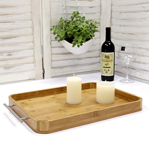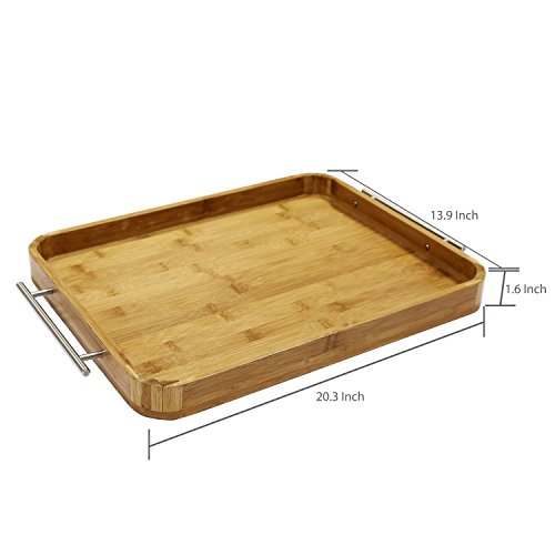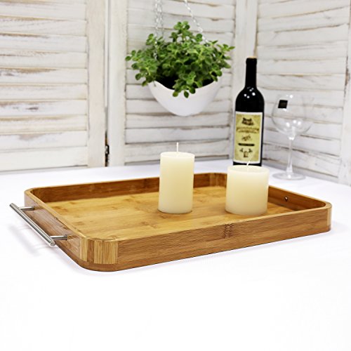 Large Bamboo Breakfast Butler Serving Tray, Decorative Accent Platter with Stainless Steel Handles