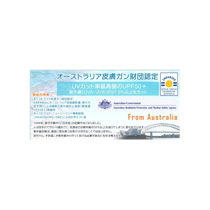 자외선 (UV) 컷율: ARPANSA(오스트레일리아 보건성 방사능 보호 핵 안전국)의 정하는 규격으로 최고가의 UPF50+.이UPF50+ 그러면,자외선 (UVA 및 UVB)의 97.5%이상을 컷 합니다.UPF란,1992년에 오스트레일리아에서 의류가 자외선을 차단하는 효과를 수치화 한 기준으로 최고 기준이 50+입니다.뉴질랜드 미국 등도 이 기준을 채용 하고 있습니다.