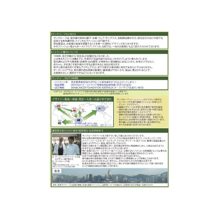 SUNGLOBE에 대해서:산 글로브는,자외선 대책 선진국 오스트레일리아의 UV제품을 제공하는 글로벌 네트워크의 멤버 펌(아시아 지구 담당)입니다.그 제품은,오스트레일리아 피부 건 재단을 비롯해,각국의 건 협회 재단에서 인정을 받고 굽히고, 구미를 중심으로 전세계에서 판매되어 있습니다. 아시아 지구 에서의 브랜드명은 SUNGLOBE입니다.오스트레일리아는 자외선이 매우 강한 나라에서,자외선에 의한 피부 건 환자가 세계에서 가장 많은 나라입니다.그 때문에,자외선 대책 기술이 진행되고 있고, 그 품질은 세계에서 인정되어 있습니다.