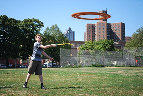 Launcher locks into extended position to allow you to catch the disk through the center of the ring