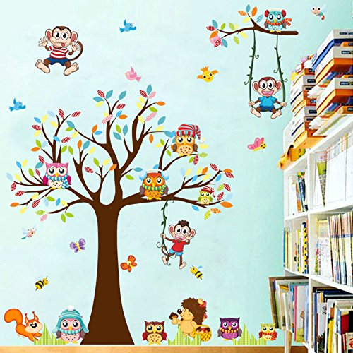 -. Title : Amaonm Removable Giant Brown Tree & Cororful Leaves Wall Decal Natural Jungle Wildlife Animals Owls,Monkey,Butterfly,Birds DIY home art Decor Wall Stickers for Bedroom Living room Nursery room