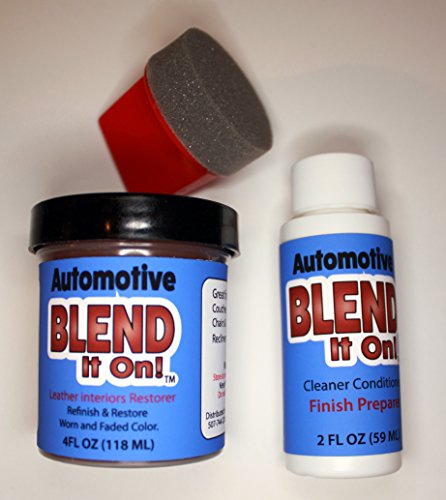 -. Brand : Blend It On -. Color : Black -. Feature : Formulated for your cars interior. Comes with 4 ounce Jar that can do 2 seats / Cleaner Conditioner / Sponge Applicator / Easy water clean up and will not rub off on clothing, Plus No Heat is Required, Dries Quickly / Restore and Repair Worn and Faded Colors or do a Complete Color Change / Looks and feels like the original finish / Easy to Use and comes with all you need to do the job right.. Just Look at the Before and After Pictures -. IsAutographed : 0 -. IsMemorabilia : 0 -. Label : Quick Company -. Manufacturer : Quick Company -. Model : 12998871111 -. MPN : 12998871111 -. PackageQuantity : 3 -. PartNumber : 12998871111 -. ProductGroup : Automotive Parts and Accessories -. ProductTypeName : AUTO_ACCESSORY -. Publisher : Quick Company -. Studio : Quick Company -. Title : Automotive Blend It On Leather Refinish Kit / Restorer Refinish Jar / Cleaner Conditioner / Sponge Applicator (Leather & Vinyl Repair)
