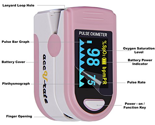 ReleaseDate : 2017-03-01 Studio : Med Shop Beyond (HPC) Publisher : Med Shop Beyond (HPC) Binding : Health and Beauty Product Description The Acc U Rate Pro Series 500D Deluxe Fingertip Pulse Oximeter is manufactured according to the CE and FDA standards set for pulse oximeters used by doctors and other health professionals. It shows your measured SpO2 and pulse rate on a high quality OLED screen (with six multi-directional display choices) and features an additional plethysmograph that measures your pulse strength. Other features include 1) Auditory alarm to warn you when your SpO2 and Pulse Rate are beyond set limits. 2) Auditory Beeps for every detected pulse. 3) Adjustable display brightness. 4) Rotatable OLED screen with plethysmograph. Acc U Rate is a registered trademark of USPTO. We will actively and aggressively pursue any parties who infringe on our intellectual property rights to the maximum extent allowed by the law. Beware of Imitation, Buy Original. Due to the influx of fake Acc U Rate products, please note that the warranty is void if the item is not purchased from Med Shop and Beyond. Acc U Rate Pulse Oximeter is designed in USA. Intended use for spot check of pulse rates and blood oxygen saturation level at home, in sport and recreational use, such as mountain climbing, high-altitude activities and running. This device is for Sports Aviation use only and is not a medical device. 0