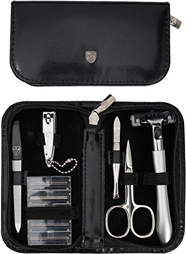 Contents: Nail scissors, finger nail clipper, razor, tweezers, sapphire nail file, replacement blades (5 pcs.)