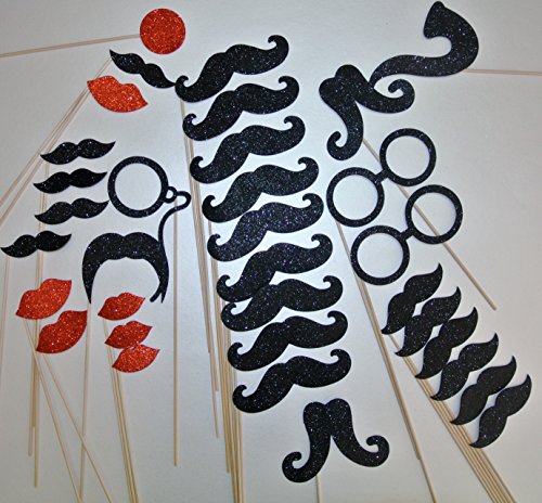 34 Pc Photo Booth Party Props Mustache on a Stick Bowler Material Glitter Foamy