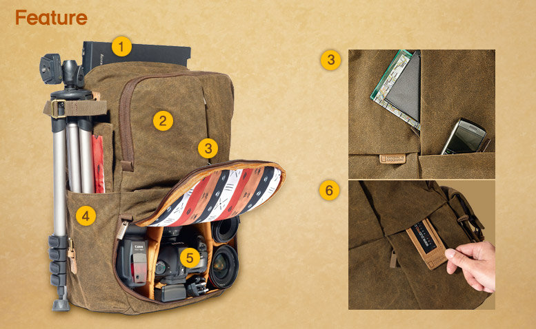 The National Geographic NG A5270 Africa Series Medium Rucksack (Brown) is designed to carry and protect a D-SLR camera or camcorder with media and accessories. A padded rear compartment can hold a laptop computer with a screen up to 15.4". A lower padded compartment holds the camera or camcorder gear. An upper storage compartment holds personal necessities. It is made from water repellent 100% cotton with a padded interior. It has a water repellent 100% polyester lining. There are 2 side pouches that can be used to support a tripod or water bottle. The pack also has 2 easy-access pockets for accessories. It is carried by backpack straps with a sternum strap. Padded, breathable fabric on the back ensures cool comfortable carrying.