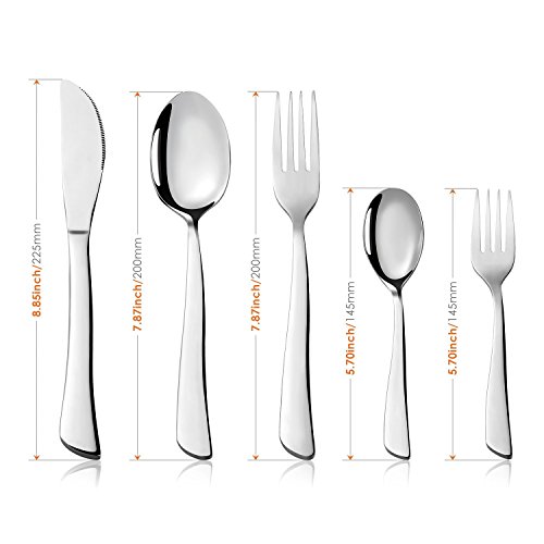 The best chose of family! The spoon and fork( regular size) are perfect for everyday meal and it has a weight but not heavy. The fork with the small sizes is also perfect for the desserts and fruits and salads.. The spoon with the small size is also perfect for dessert and coffee, also suitable for children. The table knife is good for slicing tender foods or cheese.