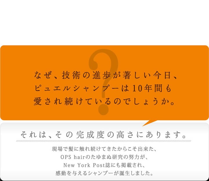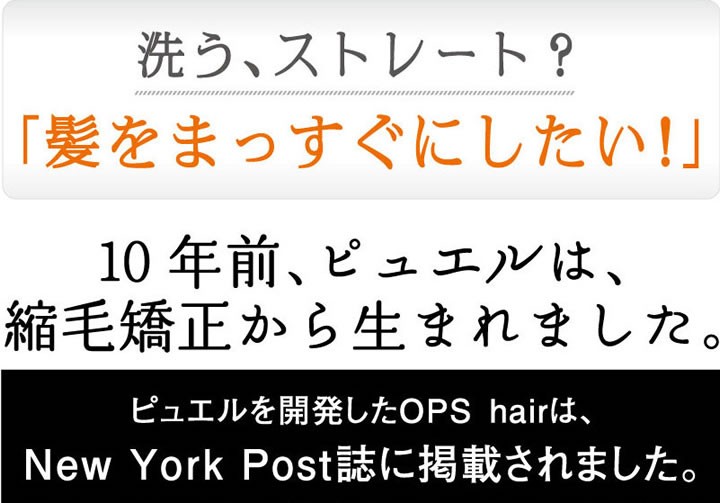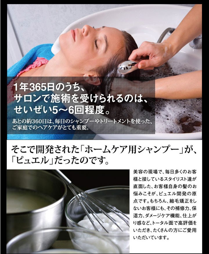 | ご使用方法 | 「ピュエルシャンプー」でシャンプー後、本品適量を毛髪全体によくなじませるように塗布し、約5分放置後、洗い流してください。 |