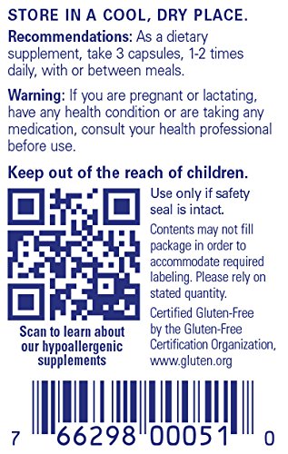 FREE FROM: Pure Encapsulations products are free from wheat, gluten, egg, peanuts, magnesium stearate, hydrogenated fat, artificial sweeteners and colors, and other unnecessary excipients. Any product containing ingredients derived from allergens, such as soy, dairy or shellfish is clearly labeled. * These statements have not been evaluated by the Food and Drug Administration. This product is not intended to diagnose, treat, cure, or prevent any disease.