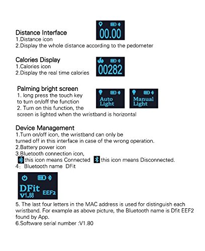 Sensitive touch screen shows time, heart rate, walking steps and distance, calories burnt, battery capacity. There are daily, weekly, monthly and annual summary of your activity, all these show on the APPs, tracks your activity apparently.