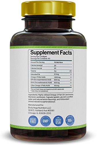 Guaranteed The Highest Quality and Purity Of Any Fish Oil Available Anywhere Is all Omega 3 Fish Oil the Same? Not all fish oil is created equally. The source, the purity, and the density of DHA make major differences in the quality of the fish oil that you put into your body. BodyVega Omega 3 Fish Oil is the highest quality fish oil that you will find anywhere. BodyVega Omega 3 Fish Oil has Amazon's highest concentration of DHA and EPA, so it supports many of the body's processes for overall health and thriving well-being, including: Brain function, so you'll be more alert, focused, and happier Healthy eyesight, including reducing tired, dry eyes Reducing pain and inflammation A healthy heart Boosted mood Carefully crafted from deep-sea, cold water fish and molecularly distilled for purity from all toxins, BodyVega is designed to have maximum potency without the nasty fish taste or burps. 60-Day Money Back Guarantee If you are anything but *thrilled* with your order, simply return the empty bottles for a 100% no hassle refund. Click the Add to Cart button now to experience BodyVega fish oil.Feature
