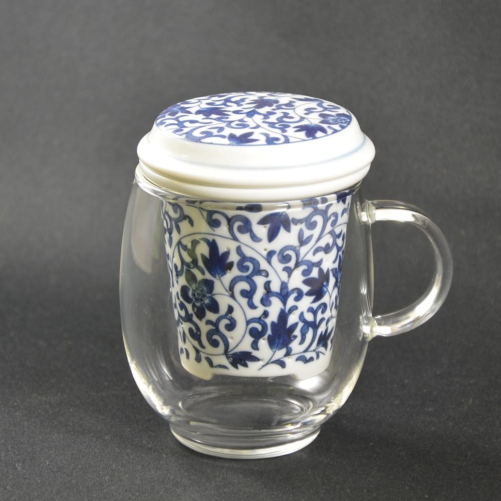 ガラスのマグカップに陶磁器の茶こしと蓋をセットしました。茶こしは底部が三つ脚になっており、マグカップに茶こしの脚を引っ掛け、熱いお茶の湯切りをすることができます。蓋は裏返すと茶こし受けとしてもご使用いただけます。ギフトにも最適♪ |