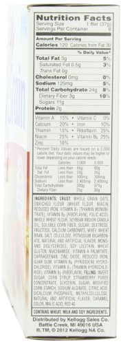 -. Feature : Pack of six, 8-count boxes of Kellogg's Nutri-Grain Strawberry Cereal Bars (48-count total) / Made with a golden baked crust of wheat and whole grain oats / Filling contains concentrated strawberry puree / Each bar contains eight grams of whole grains, three grams of fiber, and nine essential vitamins and minerals / Low-fat, low-calorie pre-portioned breakfast or snack food