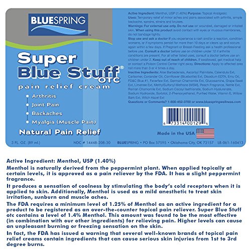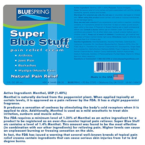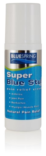 Studio : Blue Spring International Publisher : Blue Spring International Binding : Health and Beauty Product Description Super Blue Stuff OTC Pain Relief Cream by BLUESPRING is a safe topical remedy that provides amazing results in as fast as 5 minutes. It is uniquely formulated from 23 natural ingredients, 11 of which are therapeutic herbs. For this reason, it is safer to use than aspirin, pharmaceuticals and drug store pain pills. 0