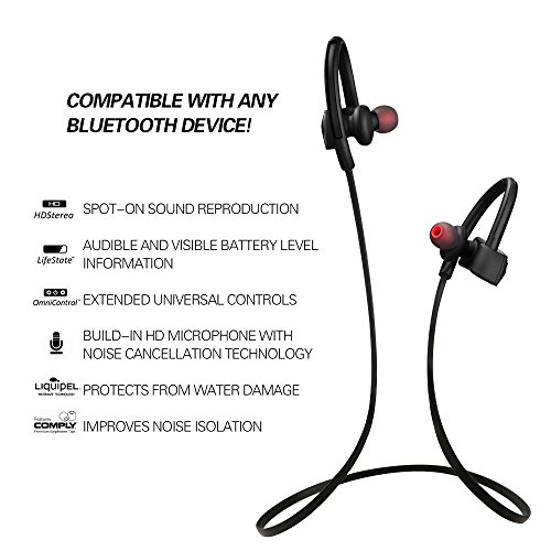 -. Feature : ▶ [Comfortable to Wear]: Soft & flexible ear hook make wearing experience much more comfortable, especially perfect for sports including gym, running, boxing, workout, yoga, biking, hiking, or leisure time relaxing. / ▶ [HD Stereo Sound & Heavy Bass]: With the CVC 6.0 noise cancellation technology, drastically reduce the extra impact of any noise, bringing you an excellent and high-end music experience. / ▶ [The Latest Bluetooth Version 4.1 + EDR]: Support for 2 connections simultaneously. Up to 33 ft operation range--Faster pairing, easier using and more powerful signal, meaning you can hear someone from your calls just like stand by you. / ▶ [IPX7 Waterproof Level]: NOT suit for swimming. But absolutely 100% sweat proof, rain-proof & snow proof, which is especially designed for sports, gym, shower.(If it fall into water, just pick it up in minutes, it won't be broken) / ▶ [8 Hours Playing Time]: 8 Hours of Continuous Use, 7 Days of Standby Time with a full charging within 2 hour.