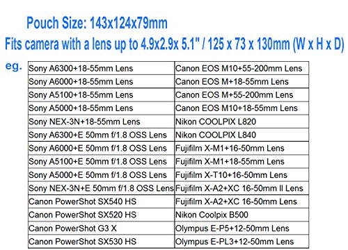 Accommodate a camera body with a lens up to 4.9 x 2.9 x 5.1" / 125 x 73 x 130mm (W x H x D). Suitable for Mirrorless Cameras and Compacts of Sony, Canon, Olympus, Fujifilm, Samsung, Panasonic