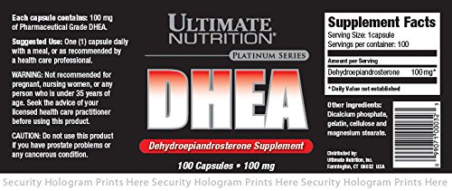 Each capsule contains 100 mg of DHEA (Dehydroepiandrosterone). Pharmaceutical grade.
