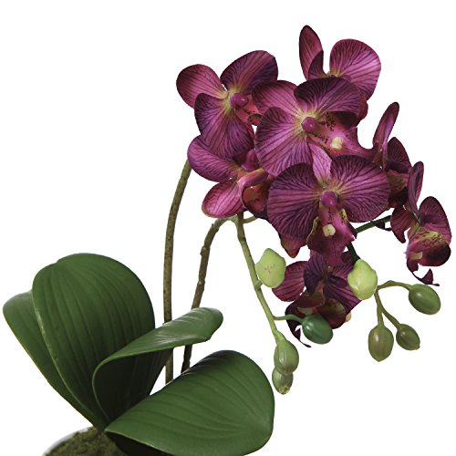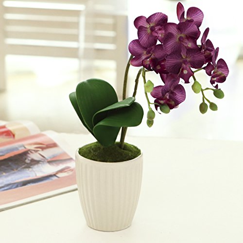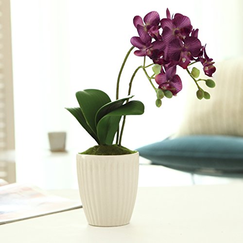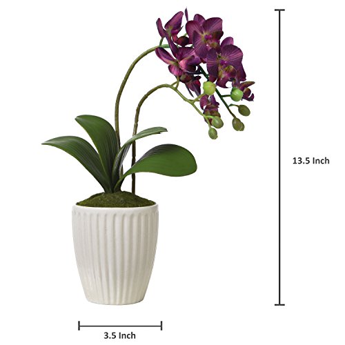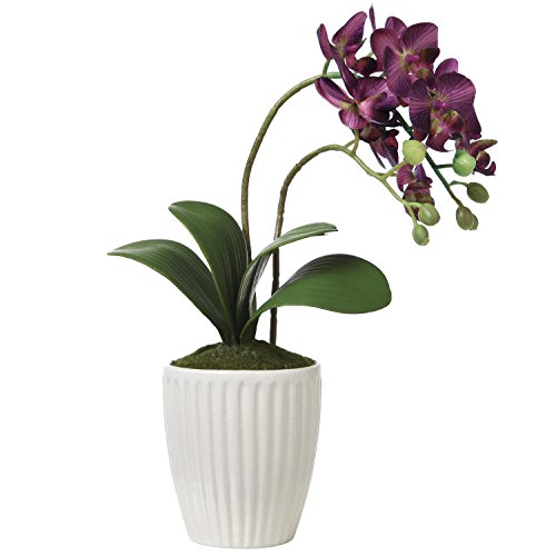 Brighten up your desk, table, shelf or dresser with these blossoming silk faux orchid flowers and modern ceramic vase. Its soft violet hues and vibrant green leaves create a tranquil environment. Wire interior leaves and stems allow you to arrange the greenery to give a realism to these artificial plants. Green moss has been added inside the ribbed ceramic vase, adding a realistic touch. No matter where you decide to showcase these beautiful blooming flowers, they are sure to add relaxation and color without the maintenance of live plants.**Official MyGift® product**