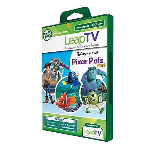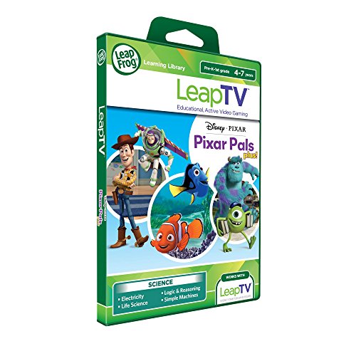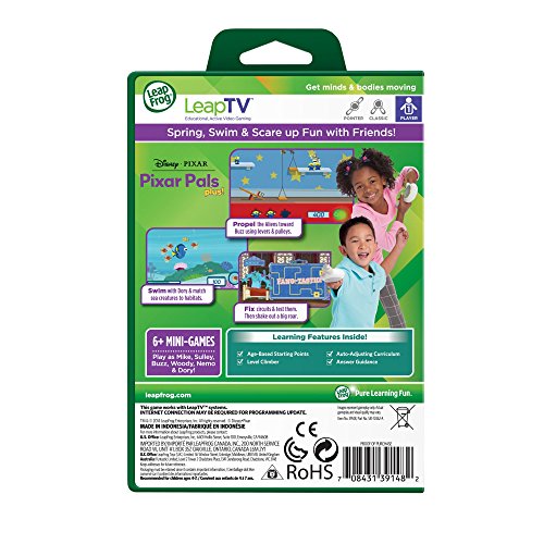 New! LeapTV, the first Educational, Active Gaming System for kids featuring Disney Pixar Pixar Pals Plus Game, sets science skills into motion for children ages 4-7 years. Spring, swim, roar and race with Buzz, Woody, Nemo, Dory, Mike and Sulley! Complete 6 action-packed missions using electricity, life science, logic and reasoning and simple machines, plus collect pieces along the way to solve 6 challenging puzzles! In Disney Pixar Pixar Pals Plus for LeapTV gaming systems, children can team up with Buzz and Woody to catch runaway train cars by using logic skills to match patterns and colors. Toy with levers, springs and pulleys to create the ultimate Alien Stunt Force course and propel the Aliens toward Buzz. Children can scare up electrical facts as they help Sulley repair scrambled circuits in the Scream Power Simulator, then test their ideas. Shake the controller to make a big roar and create electricity! Help Mike get ready for the Scare Games by using memory skills to match monsters, classify monsters by biological traits, and race the clock in a frightfully fun game of tag. Kids can also dive into ocean science with Dory and Nemo. Help Dory bump into her fishy friends and guide them to their habitats, and use the pointer to create bubble rings with Nemo to match baby sea creatures with their parents. Throughout each mission, children put science concepts into action with pals they love! Early exposure to science helps foster children's curiosity and inquisitiveness. In this game, children exercise their logic skills to solve puzzles while exploring a variety of concepts from physical science to biology. These concepts help children make sense of how things work in their world. - Clement C., PhD, LeapFrog Learning Expert Works with LeapTV gaming system (sold separately). Internet connection may be required for programming update.Feature