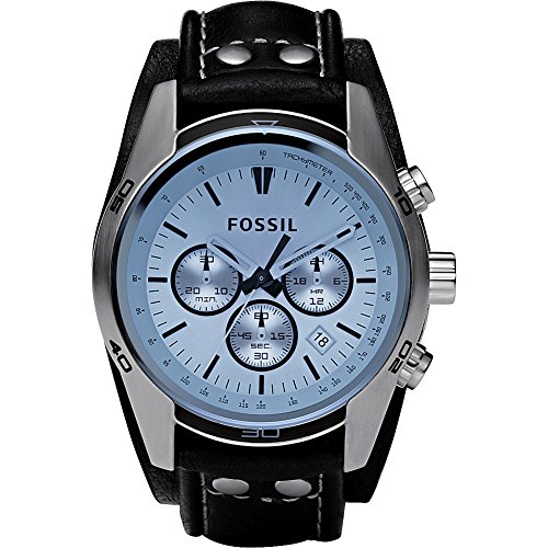 Chronograph watch in brushed silver-tone case featuring sunray dial covered with blue glass dial window