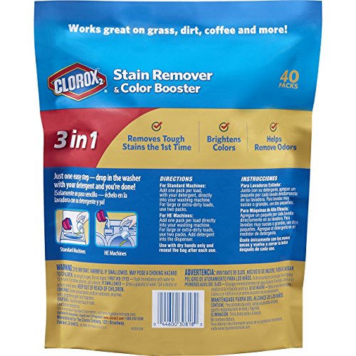 Studio : Clorox 2 Publisher : Clorox 2 Binding : Health and Beauty Product Description Clorox 2 Stain Remover and Color Booster Pack helps keep clothes looking newer, longer. These concentrated, quick dissolving packs use TripleSolve Technology to penetrate, dissolve and eliminate tough stains. The 3 in 1 packs brighten colors, help remove odors and tough stains, such as grass, coffee, dirt and more. They are easy to use, just add one Clorox 2 Stain Remover and Color Booster pack along with detergent into standard or high efficiency washing machines and you are done. Keep clothes looking their best longer with Clorox 2 Laundry Stain Remover and Color Booster packs. 0