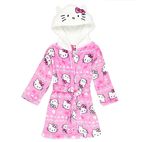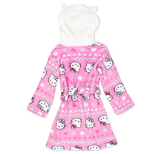 Get ready for bed in this adorable fleece Hello Kitty bathrobe! It's warm, yet light, and is a cozy way to snuggle up before bedtime. This robe is tailored from soft fleece for added comfort, and features your favorite little kitten, Hello Kitty! This bathrobe also features a hood with 3D ears for added fun! It's perfect for lounging around, stepping out of the shower, or for extra warmth over your pajamas! This bathrobe will keep your little one looking stylish at any sleepover! This garment is made from flame resistant fabric for your child's safety.Feature