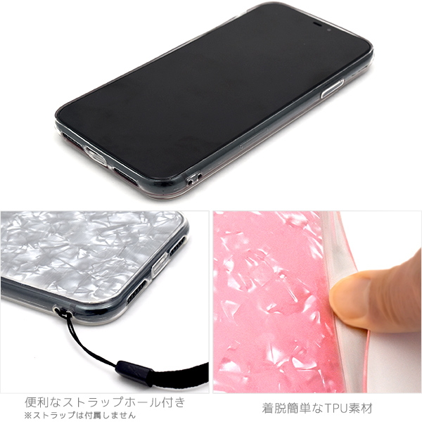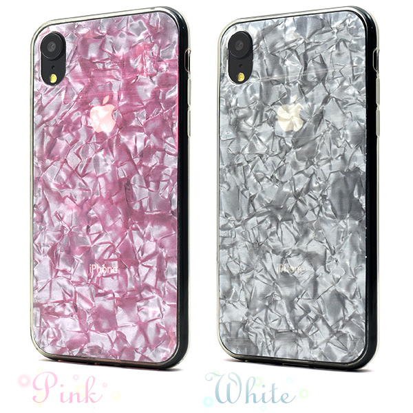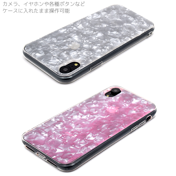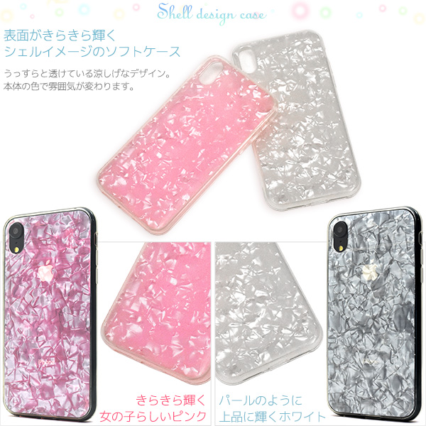 iPhone XR用カバーのシェルデザインケース。 光を反射して、きらきら輝くシェルイメージのソフトケースです。 側面はクリア仕様で、表面もうっすらと透けているので、本体の色で雰囲気が変わります!