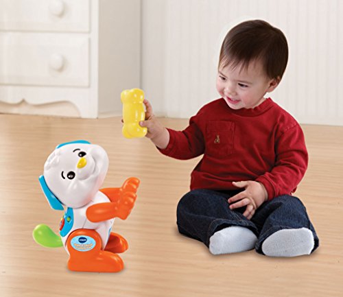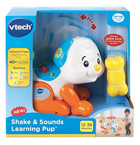 Learn and play with the interactive Shake & Sounds Learning Pup by VTech. Simply shake the bone-shaped rattle and the puppy responds by walking, standing up and turning around while engaging your child with fun phrases, songs and more.