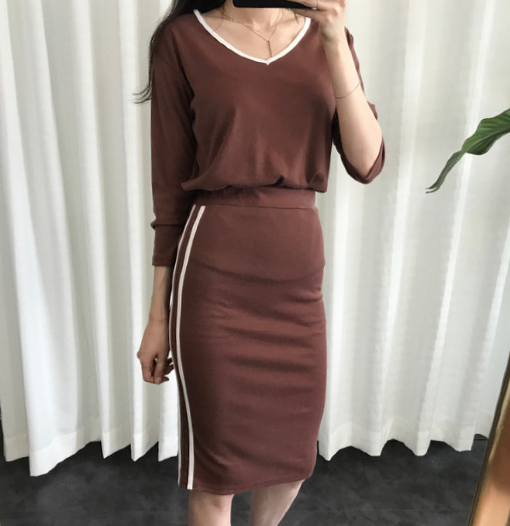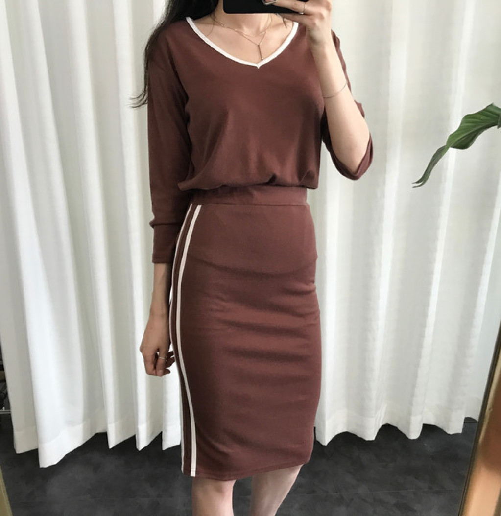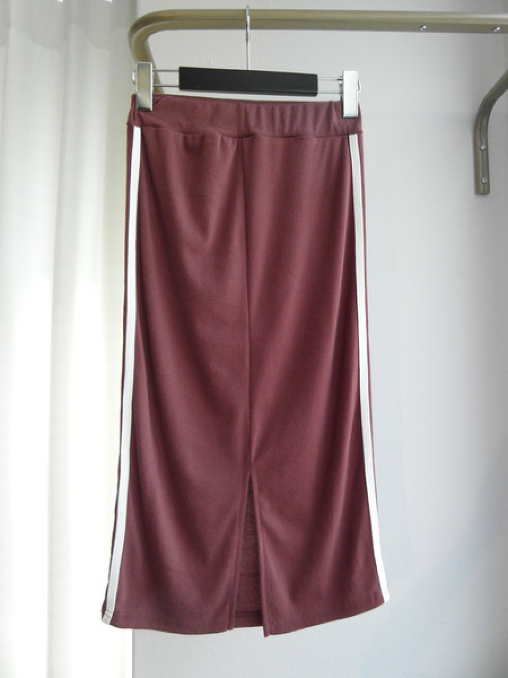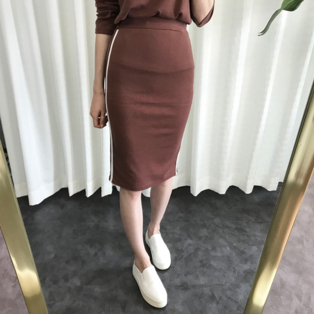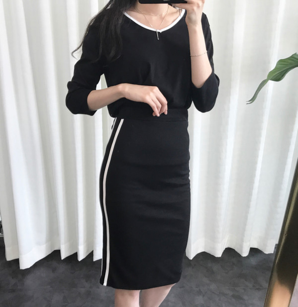 옆면에 두줄 라인이 들어간 슬림한 스커트 입니다