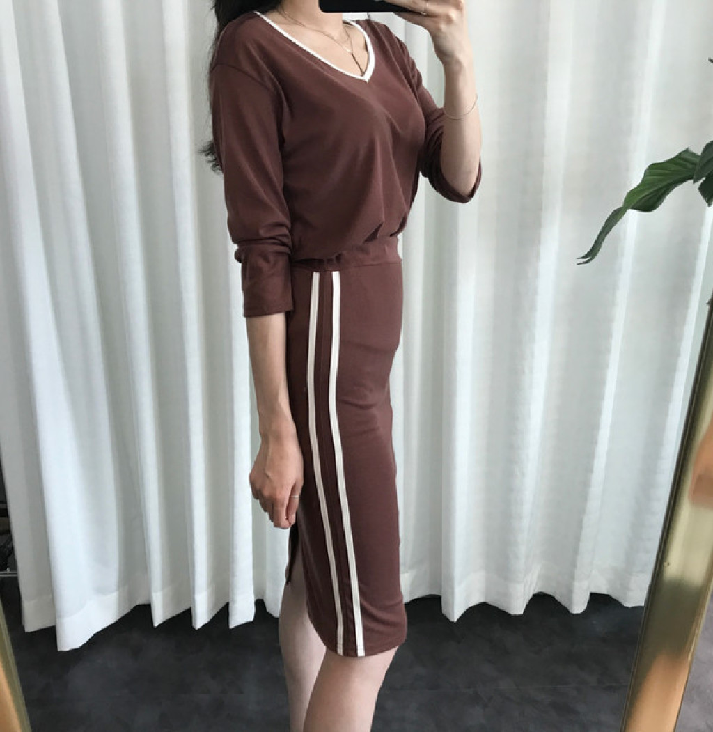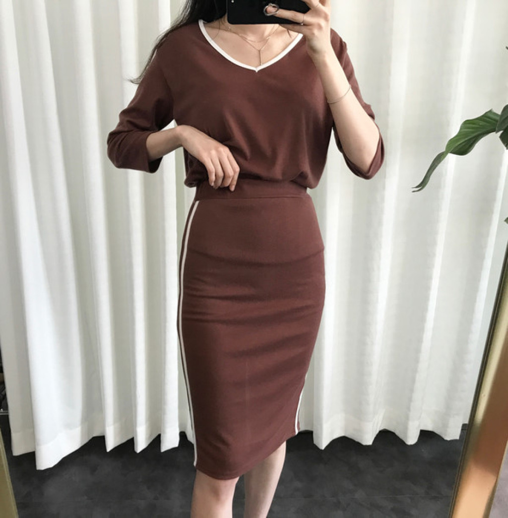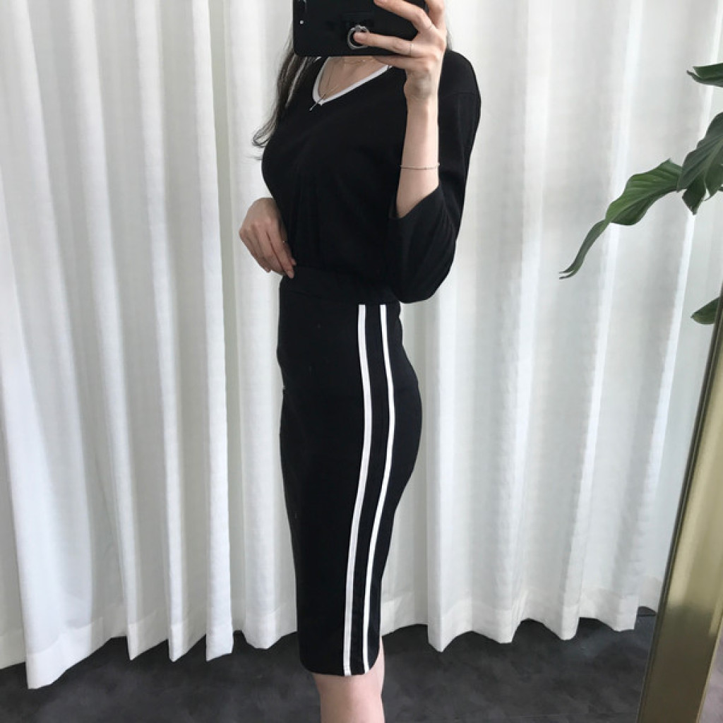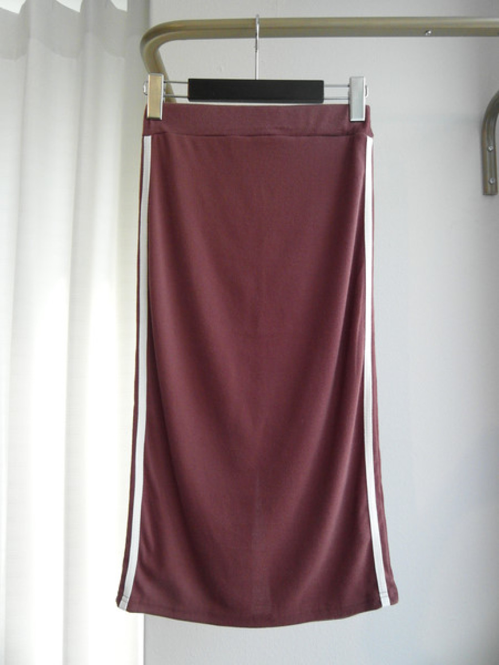 옆면에 두줄 라인이 들어간 슬림한 스커트 입니다