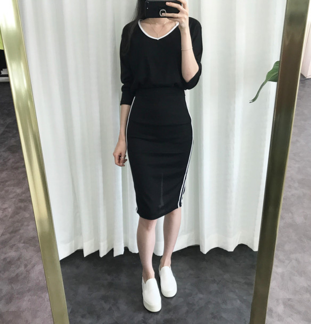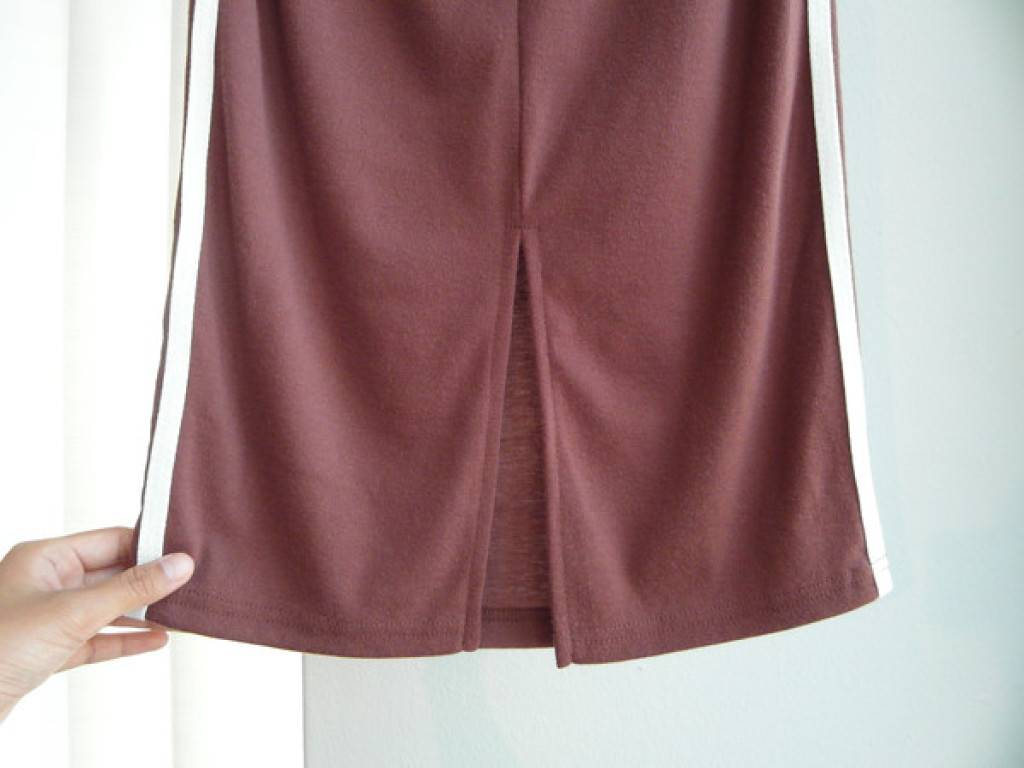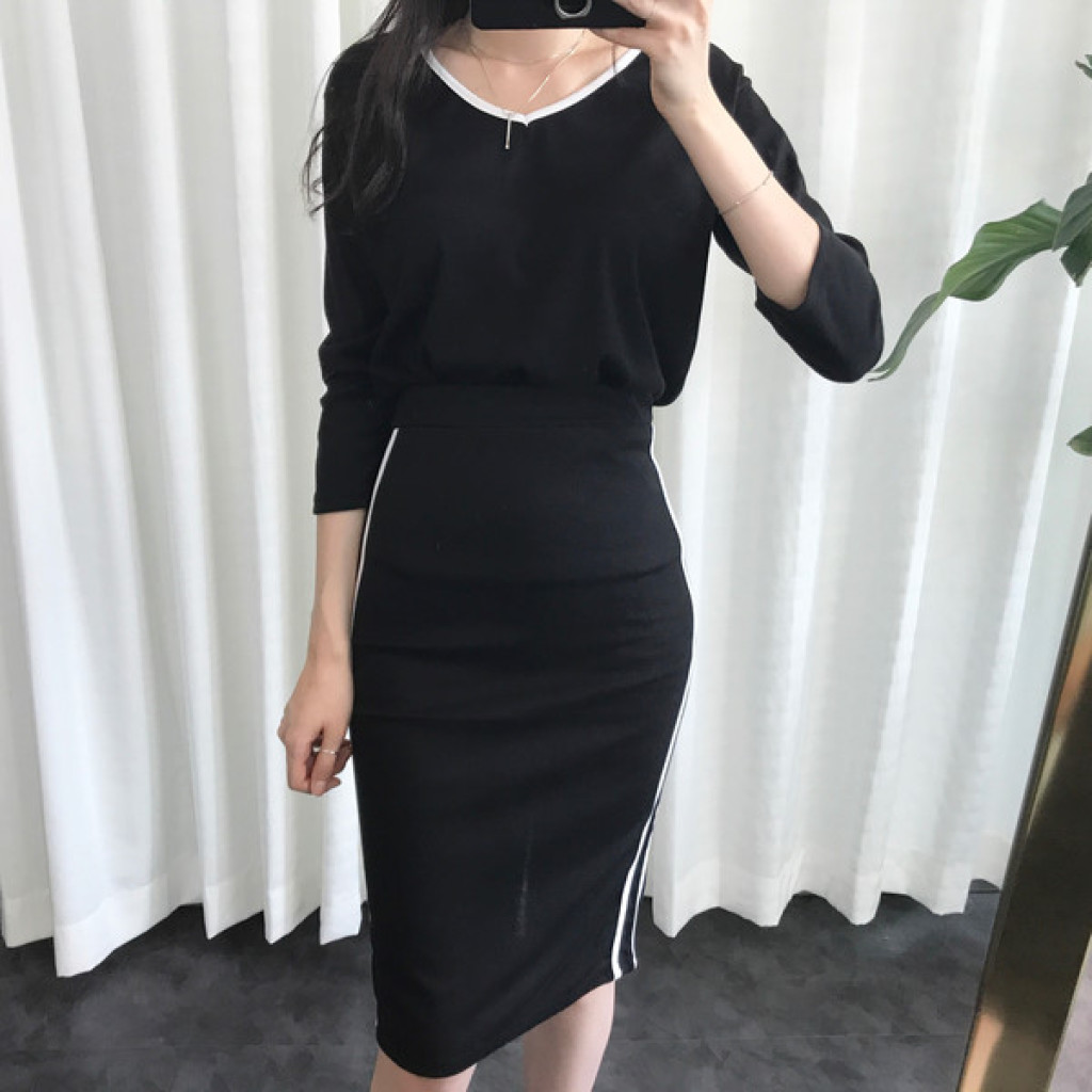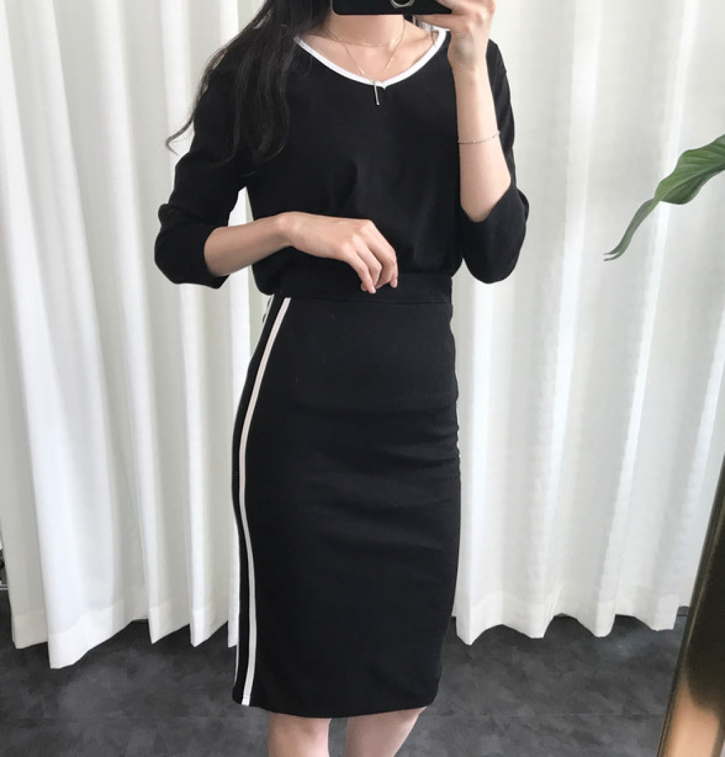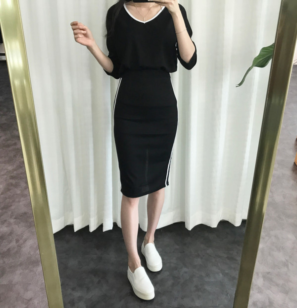 옆면에 두줄 라인이 들어간 슬림한 스커트 입니다