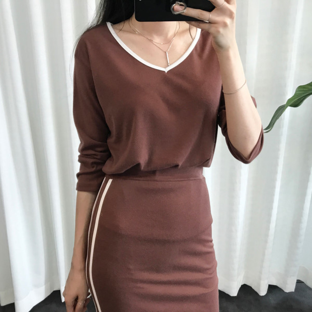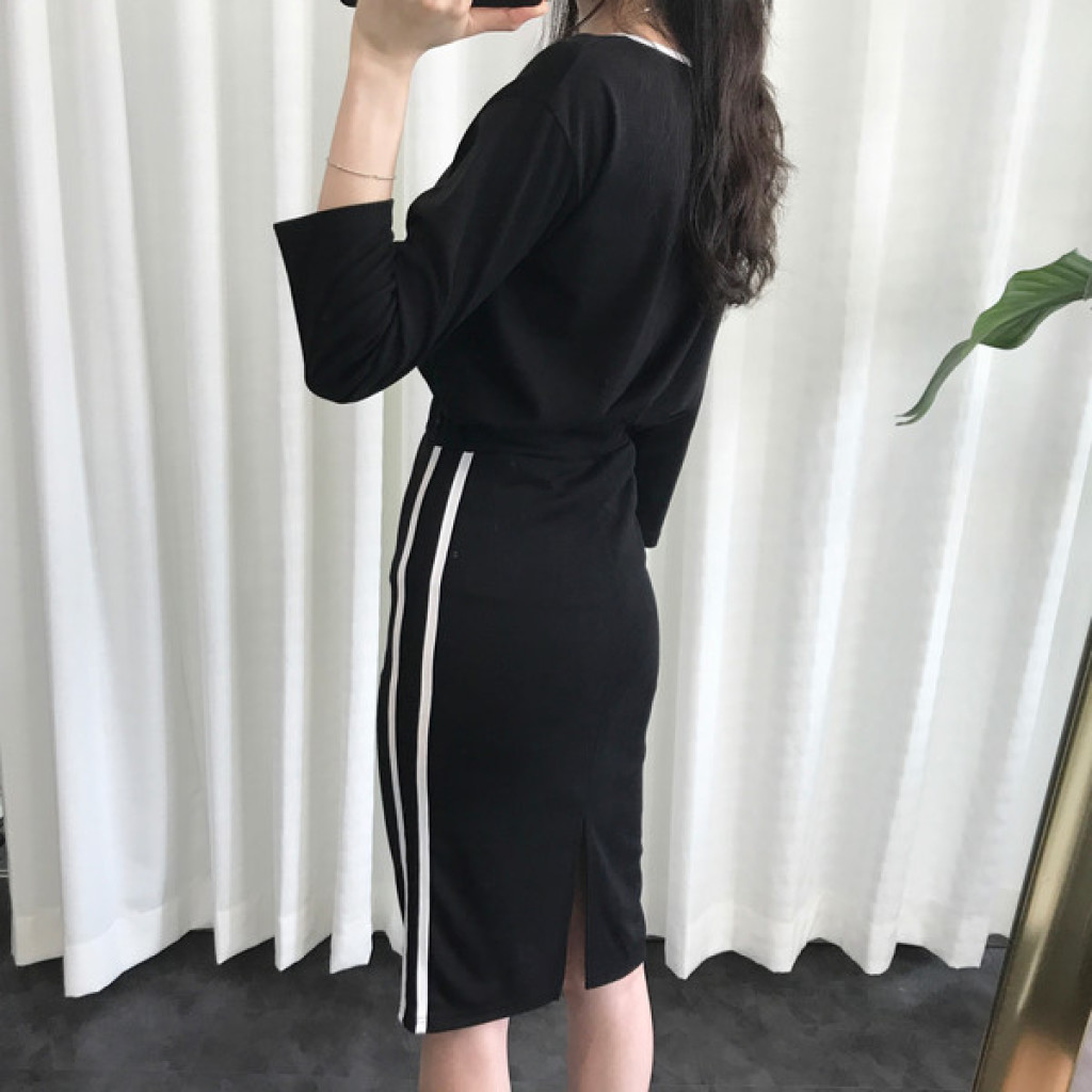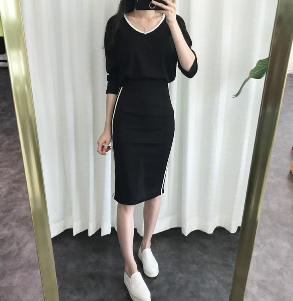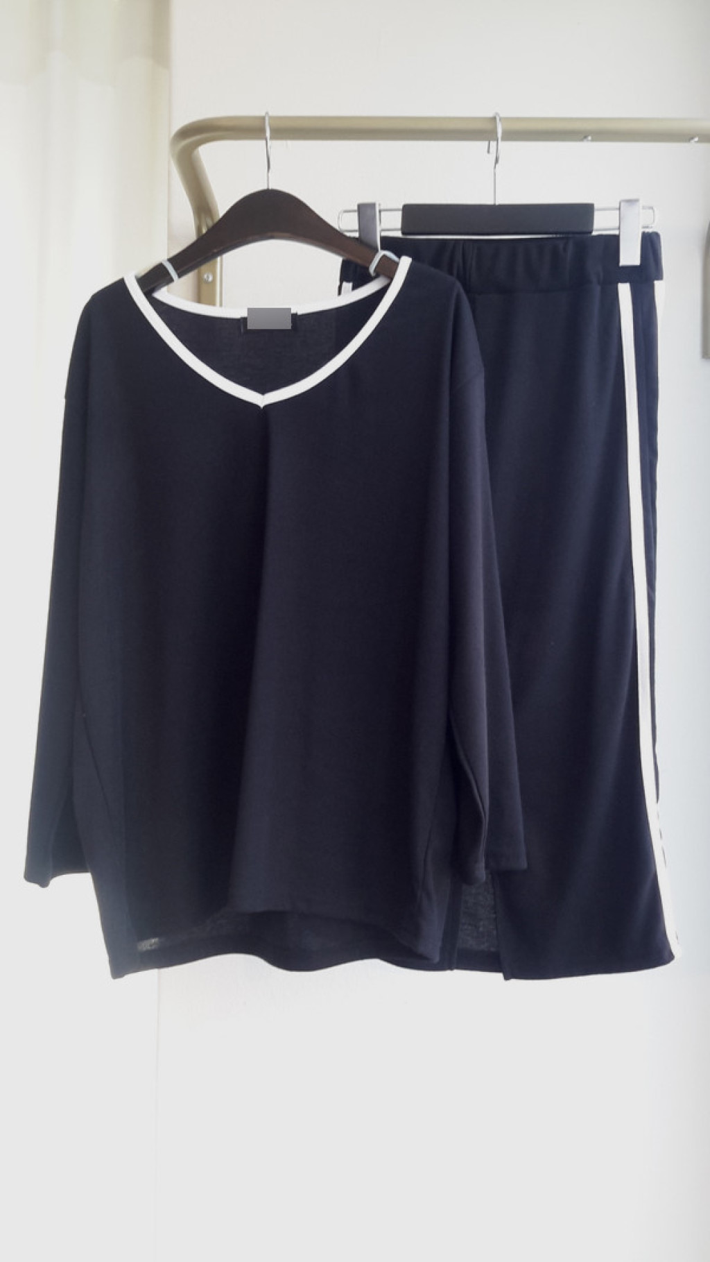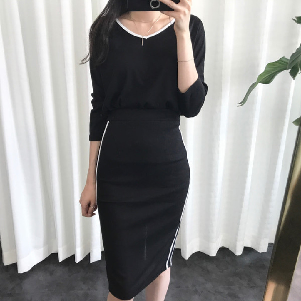 옆면에 두줄 라인이 들어간 슬림한 스커트 입니다