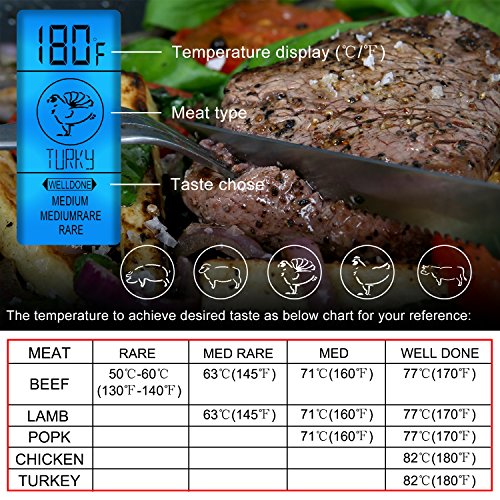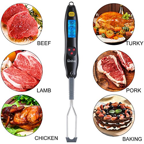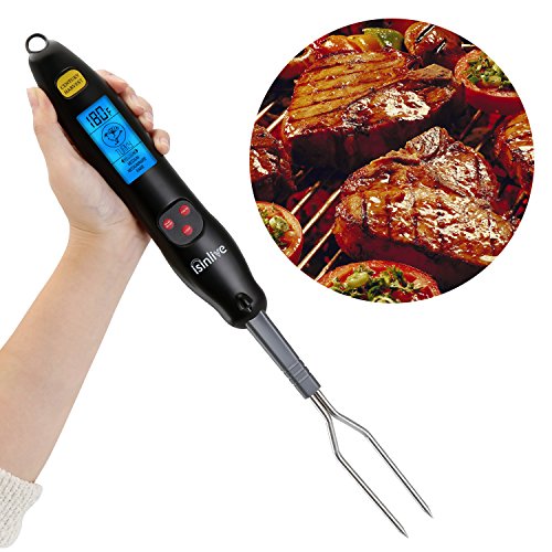 Studio : Isinlive Publisher : Isinlive Product Description It will be easy to know when the meat is ready with this new barbecue thermometer. It will monitor the accurate temperature and indicate when meat is cooked from rare to well down. Whether you are indoor cooking or outdoor grilling, this barbecue fork will be your perfect assistant in cooking your meat at favorite taste. Specification: Temperature range: 0℃~100℃(32℉~212℉) Temperature resolution: 1℃/1℉ Temperature accuracy: ±1℃(1.8℉) Power supply: 2*1.5V AAA batteries(not include) Stainless steel probe: 304# φ5X125mm Cautions: 1, Never submerge the fork into water 2, Clean the fork with soapy water before use. 3, Always use standard AAA batteries. 4, Do not use the fork for eating. 0