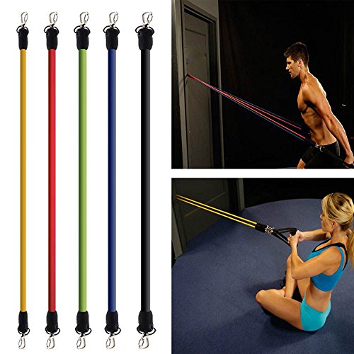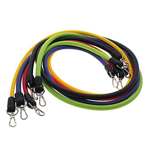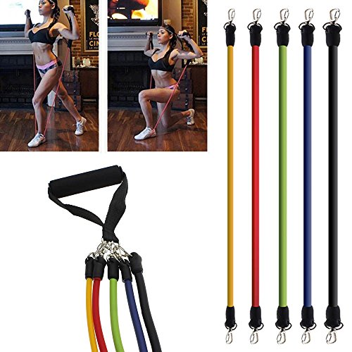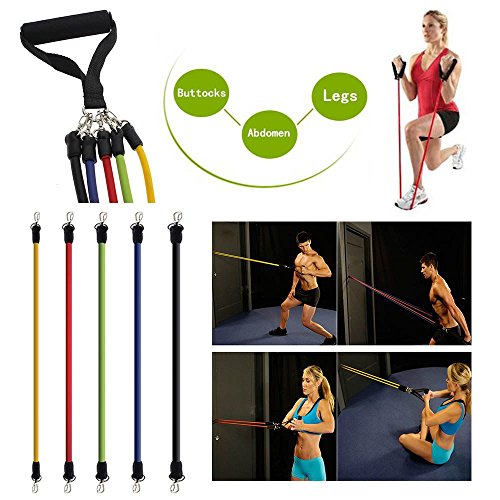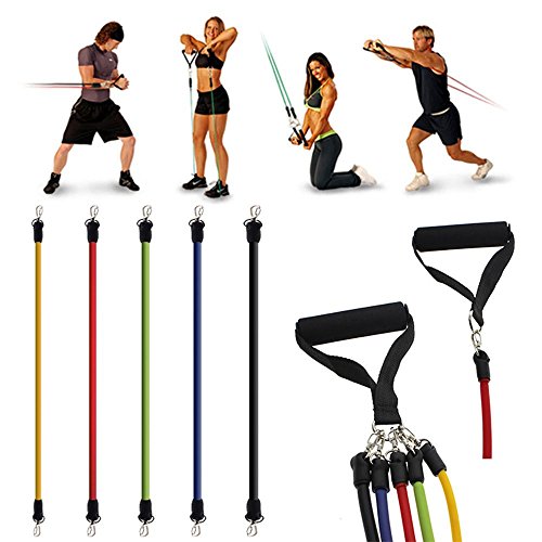 Studio : HuaYang Publisher : HuaYang Binding : Misc. Product Description Description: Bands are made of professional quality rubber latex. Strong cushioned foam handles with zinc alloy clips and D-ring. Easily creating over 30 different resistance levels by attaching 1, 2, 3, 4, or all 5 bands to the handles, covering All Areas of The Body Including Arms, Chest, Back, Abs, Legs Perfect for Yoga, Pilates, workout. Specification: Material: Latex Color: as the pictures show Resistant Bands length: Approx. 112.5cm(each) Package list: 2 Foam covered handles 2 Ankle straps 1 Door anchor 1 Carrying bag 5 Resistant Bands? Please kindly Note: Items will be repackaged to save your shipping charge to be environmentally friendly. We guaranty the item will be protected well in buble bags, No retail box! 0