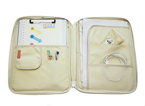 Multi-pocket design: OUSIDE: a pocket on the front and a zipper pocket on the back; INSIDE: a note book pocket, a small pocket, a large pocket for iPad and a large zipper pocket on the left, a mesh pocket, a pocket for pens or other things and two pockets for documents on the right.
